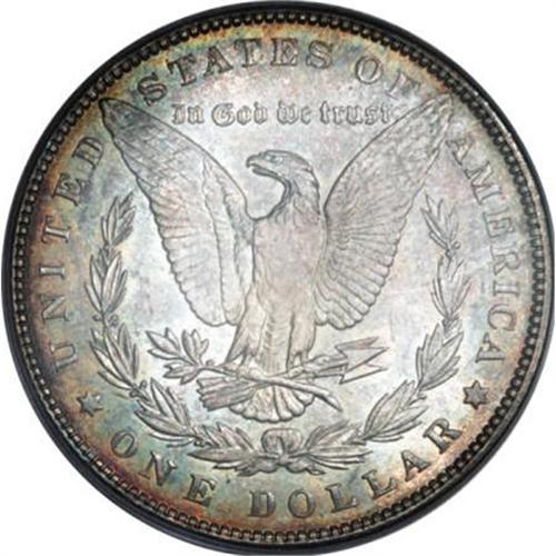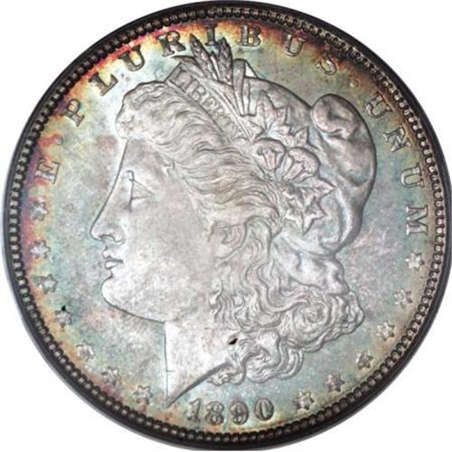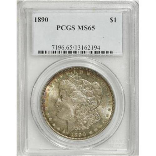 <B>1890 $1 MS65 PCGS.</B></I> Aquamarine, cherry-red, and yellow-gold enrich this lustrous and refreshingly unabraded Gem. The hair above the ear and the eagle's breast lack full design definition. Given its mintage of 16.8 million pieces, the 1890 is surprisingly rare above the MS65 level. In fact, PCGS has certified only a single example finer (11/07).<BR><BR><B>Coin Engraver:</B> George T. Morgan<BR><BR><b>Shipping:</b> Coins & Currency (<a target="_blank" href="http://www.heritageauctions.com/common/shipping.php">view shipping information</a>)