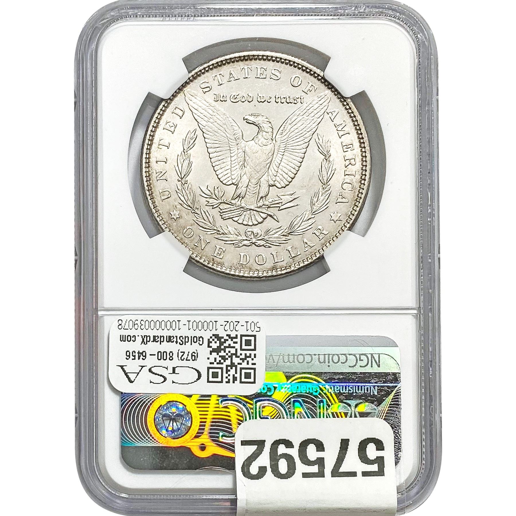 e. Coins sold referencing a third-party grading service are sold “AS IS” without any express or implied warranty, except for a guarantee by GSA that they are genuine. Removal or alteration of the holder, voids all of Bidder’s claims concerning that Product. Certain warranties may be available from the grading services and Bidders are referred to them for further details: Numismatic Guaranty Corporation (NGC), PO Box 4776, Sarasota, FL 34230, www.ngccoin.com/services/writtenguarantee.asp; Professional Coin Grading Services (PCGS), PO Box 9458, Newport Beach, CA 92658, www.pcgs.com/guarantee.html; ANACS, 6555 S. Kenton St., Ste. 303, Englewood, CO 80111; and Independent Coin Grading Co. (ICG), 7901 East Bellview, Ave., Suite 50, Englewood, CO 80111.