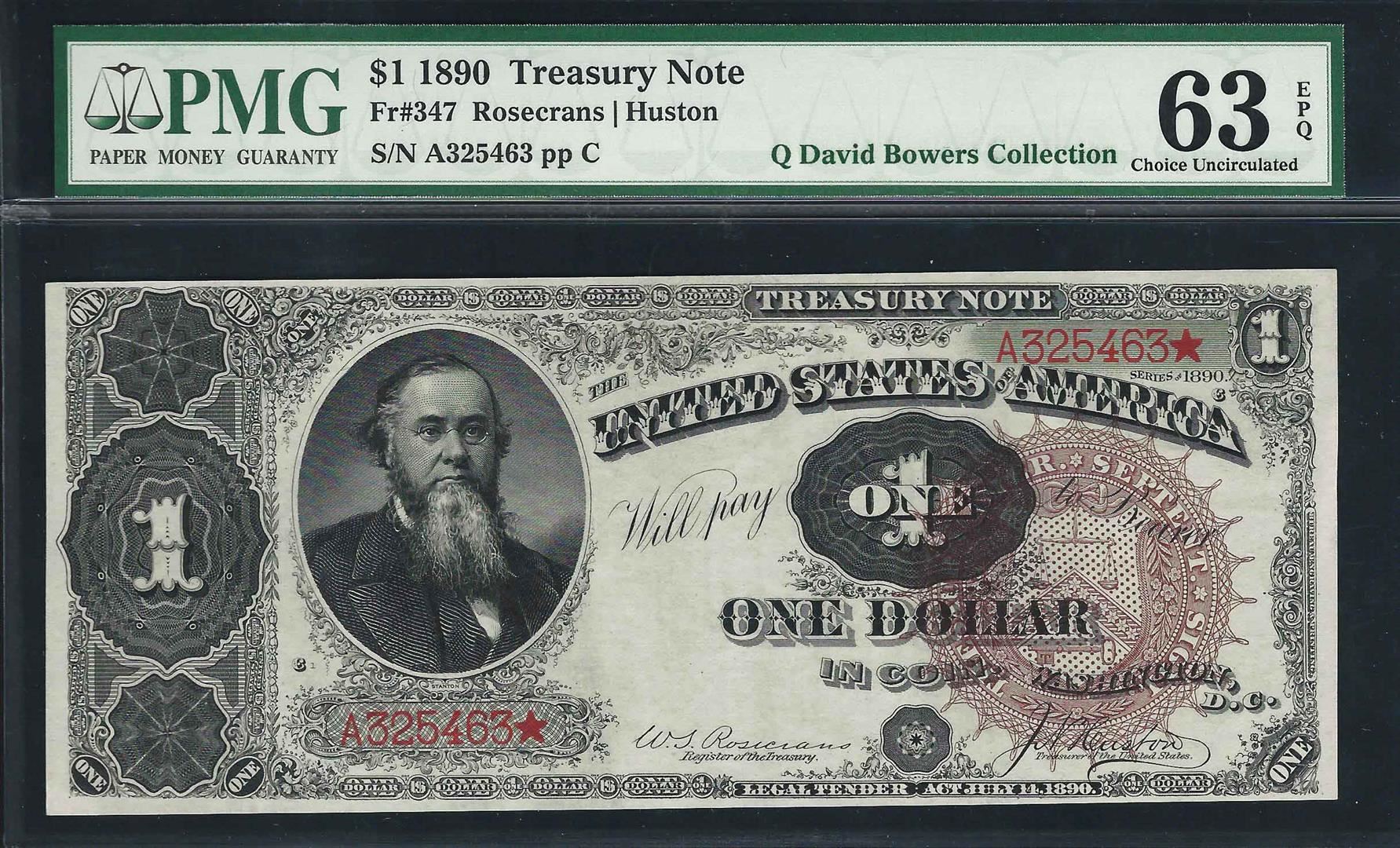 One 1890 $1 Treasury Note Fr.347 PMG Choice Uncirculated 63EPQ. PMG Certified.