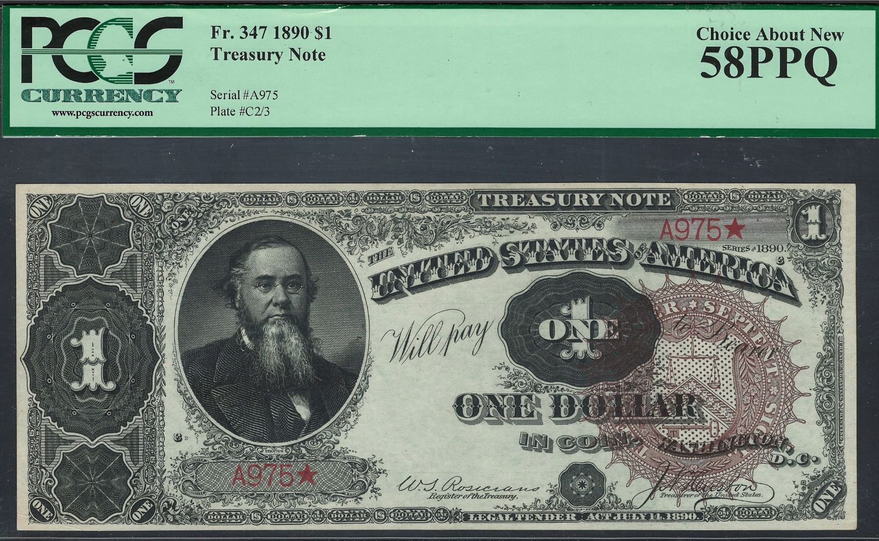 One 1890 $1 Treasury Note PCGS 58PPQ.