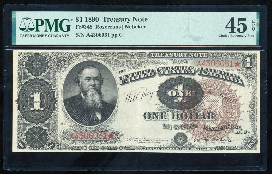 One 1890 $1 Treasury Note PMG 45EPQ.