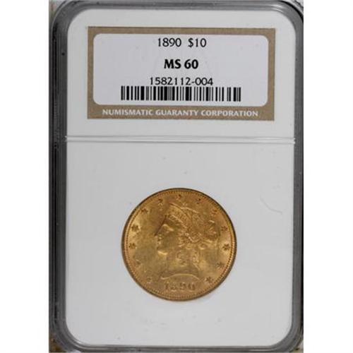 <B>1890 $10 MS60 NGC.</B></I> NGC Census: (60/151). PCGS Population (28/145). Mintage: 57,900. Numismedia Wsl. Price for NGC/PCGS coin in MS60: $550. (#8717)<BR><BR><B>Coin Engraver:</B> Christian Gobrecht<BR><BR><b>Shipping:</b> Coins & Currency (<a target="_blank" href="http://www.heritageauctions.com/common/shipping.php">view shipping information</a>\)