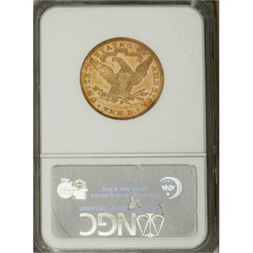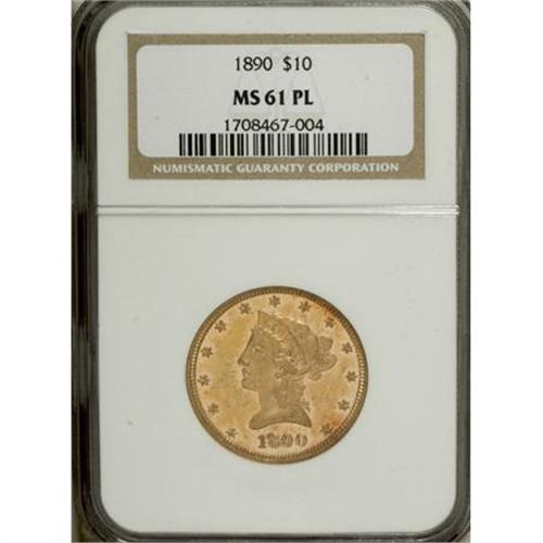 <B>1890 $10 MS61 Prooflike NGC.</B></I> 1890 was a low mintage year at Philadelphia, and only 57,980 eagles were struck. This pumpkin-gold example has flashy fields and a precise strike. A scratch beneath the branch stem determines the grade. Census: 1 in 61 Prooflike, 0 finer (5/07).<BR><I>From The Vanek Collection.</B></I><BR><BR><b>Shipping:</b> Coins & Currency (<a target="_blank" href="http://www.heritageauctions.com/common/shipping.php">view shipping information</a>)