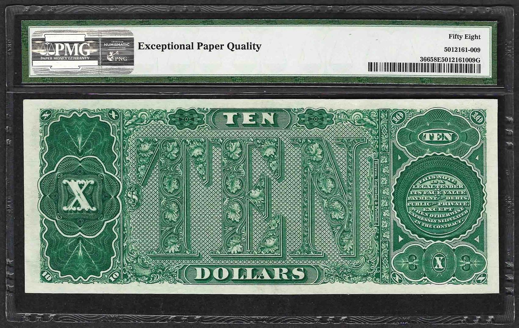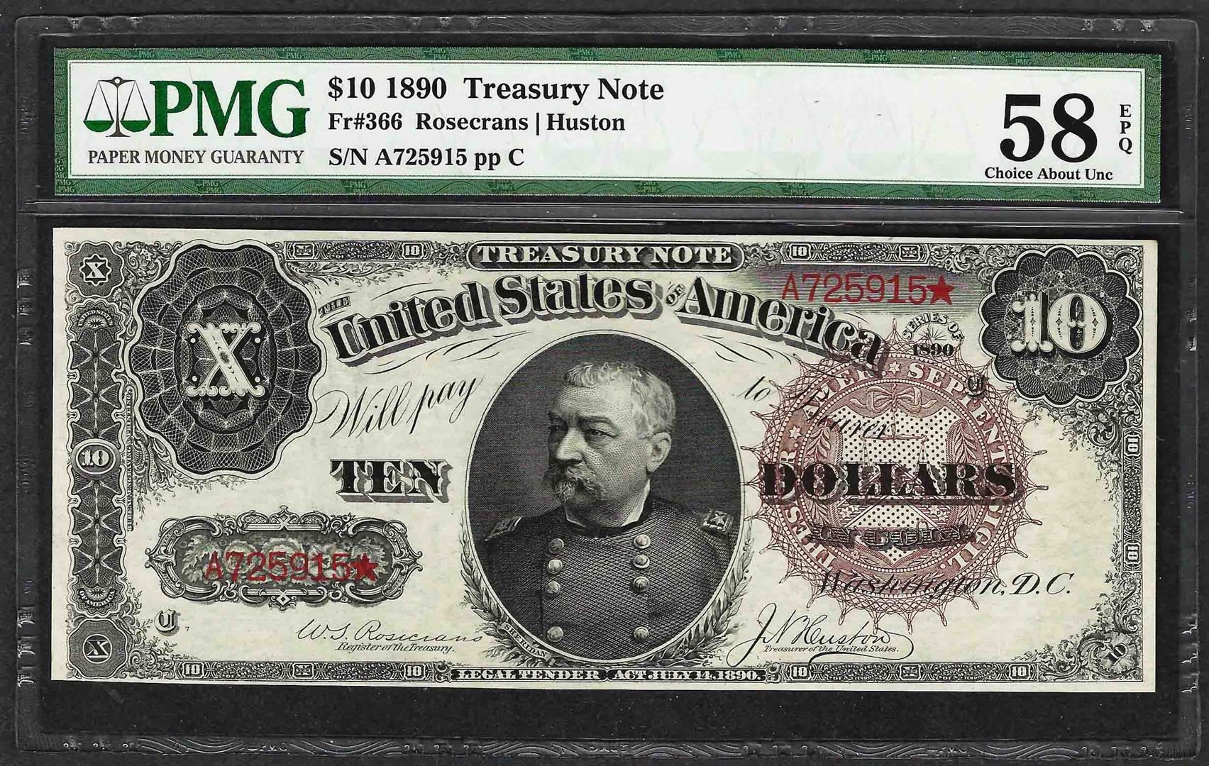 One 1890 $10 Treasury Note Fr.366 PMG Choice About Uncirculated 58EPQ. This is graded in the top 10 of the notes graded by either PMG or PCGS Currency and is sure to be the highlight of any collection. PMG Certified.