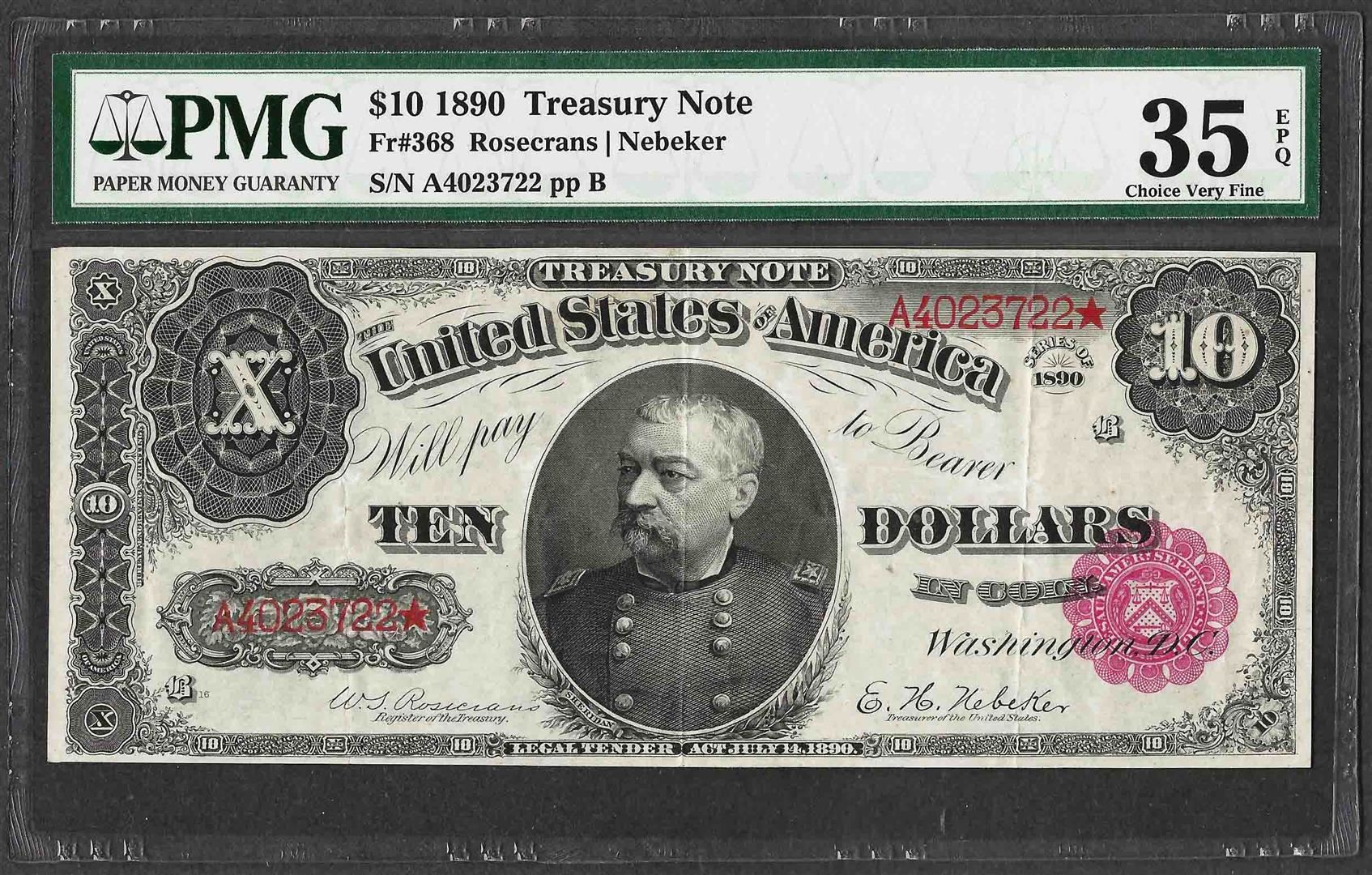 One 1890 $10 Treasury Note Fr.368 PMG Choice Very Fine 35EPQ. PMG Certified.