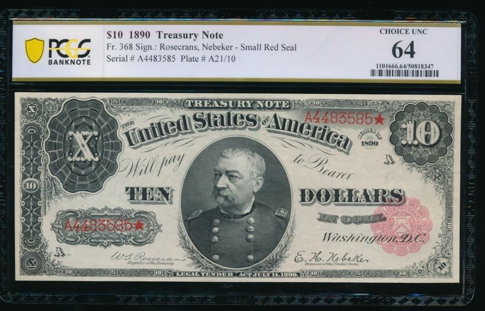 One 1890 $10 Treasury Note PCGS 64.