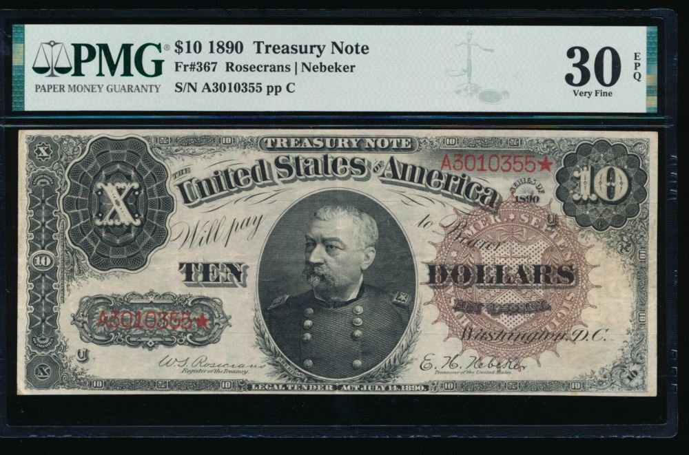 One 1890 $10 Treasury Note PMG 30EPQ.