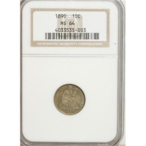 <B>1890 10C MS64 NGC.</B></I> NGC Census: (124/127). PCGS Population (119/87). Mintage: 9,910,951. Numismedia Wsl. Price for NGC/PCGS coin in MS64: $400. (#4704)<BR><BR><B>Coin Engraver:</B> Christian Gobrecht<BR><BR><b>Shipping:</b> Coins & Currency (<a target="_blank" href="http://www.heritageauctions.com/common/shipping.php">view shipping information</a>)