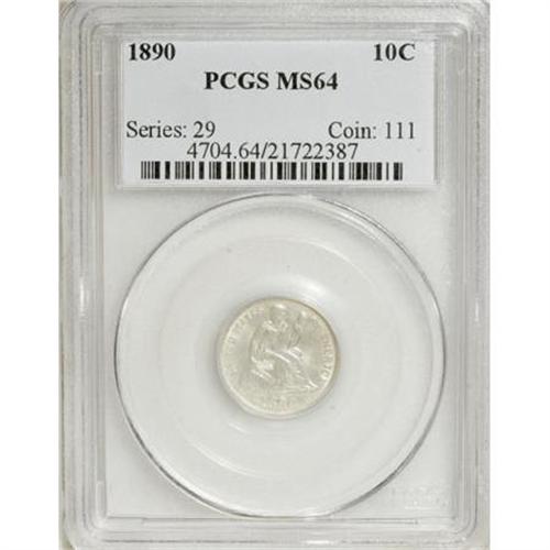 <B>1890 10C MS64 PCGS.</B></I> . PCGS Population (119/89). NGC Census: (126/126). Mintage: 9,910,951. Numismedia Wsl. Price for NGC/PCGS coin in MS64: $400. (#4704)<BR><BR><B>Coin Engraver:</B> Christian Gobrecht<BR><BR><b>Shipping:</b> Coins & Currency (<a target="_blank" href="http://www.heritageauctions.com/common/shipping.php">view shipping information</a>)