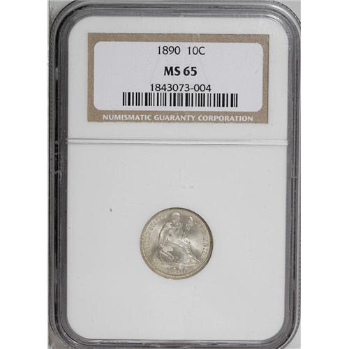 <B>1890<10C> MS65 NGC.</B></I> An elegant and essentially untoned Gem with great luster and a bold strike. A planchet flaw appears on the figure of Liberty above the shield.