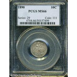 1890 10C MS66 PCGS. Iridescent cobalt-blue, light <B>1890 10C MS66 PCGS.</B></I> Iridescent cobalt-blue, light gray, and gold toning visits lustrous surfaces that are virtually mark free. Nice definition is apparent on all of the design elements. Population: 30 in 66, 3 finer (10/04). <BR><BR><B>Important notice:</B> Heritage usually auctions material at the rate of 200-250 lots per hour. On some occasions eBay Live bid software or the Internet may not be able to keep up with the pace of the auction. We recommend placing a realistic absentee bid now as insurance to avoid disappointment. Occasionally the auctioneer may eliminate or reject an eBay Live bid, and the auctioneer may also reopen a lot after the close of the eBay live bidding (usually because we missed an audience bid), and may reject your bid even if it shows you as the winning bidder. By bidding via eBay Live, you agree that Heritage may award the lot to another bidder at its sole discretion under the circumstances described above or any other reasonable circumstances. Since eBay bids are not shown to us until we open the lot on the floor, we treat those bids just like floor bids. In most cases the floor responds before the eBay bid is presented to us, due to Internet lag time, so for consistency we have made it a policy that floor bids are always considered first over tie eBay live bids. Also please note that all Heritage lots purchased through eBay Live carry a 20% Buyer's Premium. Please make sure you read the Terms and Conditions before you bid. This lot is being auctioned in conjunction with a live floor auction by Heritage Galleries & Auctioneers. All final auction and invoice information will be supplied by Heritage Galleries & Auctioneers, and all other information should be considered preliminary. Lot:5748