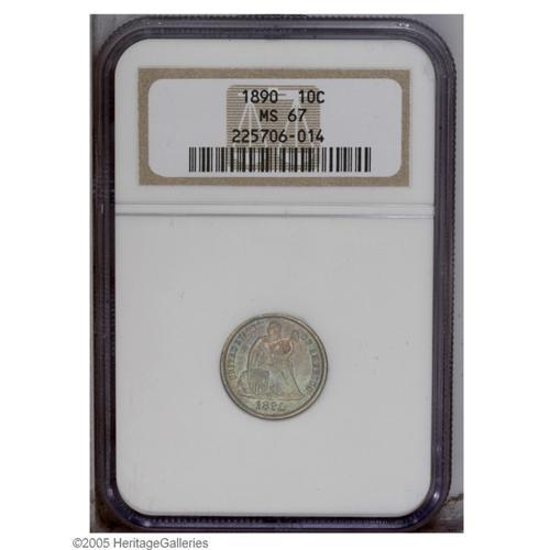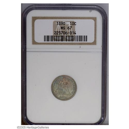 <B>1890<10C> MS67 NGC.</B></I> The 1890 dime is somewhat available through MS64, but it becomes quite scarce in higher grades. In the lofty grade of MS67, NGC and PCGS combined have certified ten examples, and one piece higher (10/05). And according to our auction records, only one Superb Gem has appeared for public sale over the past few years. The present coin shows dazzling luster and mauve and cobalt-blue patination. The design features are exquisitely struck, and there are no mentionable marks to report. Population: 7 in 67, 1 finer (10/05).