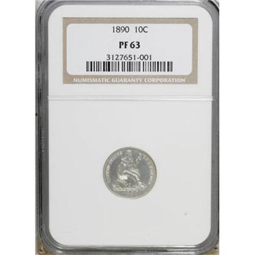 <B>1890 10C PR63 NGC.</B></I> . NGC Census: (26/116). PCGS Population (34/88). Mintage: 590. Numismedia Wsl. Price for NGC/PCGS coin in PR63: $425. (#4787)<BR><BR><B>Coin Engraver:</B> Christian Gobrecht<BR><BR><b>Shipping:</b> Coins & Currency (<a target="_blank" href="http://www.heritageauctions.com/common/shipping.php">view shipping information</a>)