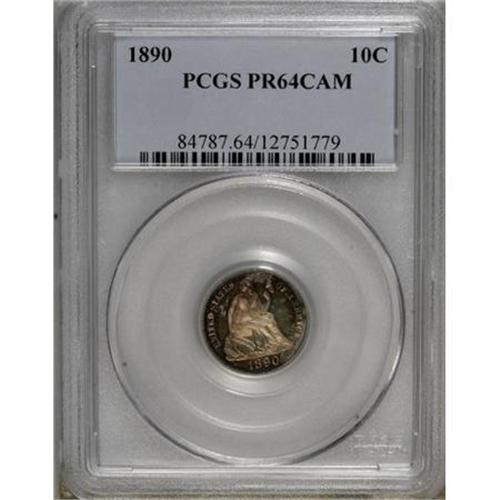 <B>1890 10C PR64 Cameo PCGS.</B></I> Despite rich patina over each side, this late-date Seated dime proof offers undeniable contrast. Lightly frosted devices are ivory-gold and orange, while the fields have deeper burgundy and blue-violet patina. Population: 6 in 64 Cameo, 14 finer (2/08).<BR><BR><b>Shipping:</b> Coins & Currency (<a target="_blank" href="http://www.heritageauctions.com/common/shipping.php">view shipping information</a>)