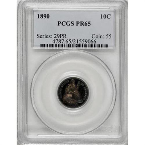 <B>1890 10C PR65 PCGS.</B></I> Vibrant bands of blue and green patina grace the outer areas, while the figure of Liberty and the wreath offer elements of gold-rose and champagne. A wonderful Gem specimen of this late-date Seated proof issue. Population: 25 in 65, 22 finer (10/07).<BR><BR><B>Coin Engraver:</B> Christian Gobrecht<BR><BR><b>Shipping:</b> Coins & Currency (<a target="_blank" href="http://www.heritageauctions.com/common/shipping.php">view shipping information</a>)