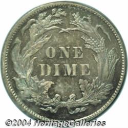 <table><tr><td><table><tr><td>1890 10C PR66 Cameo PCGS. An impeccable two-toned specimen that is layered in golden-rose and pale violet hues, with turquoise accents being confined to the major devices. Population: 1 in 66 Cameo (5 with 5 finer at NGC), 0 finer (3/04). <BR><BR><B>Important notice:</B> Heritage usually auctions material at the rate of 200-250 lots per hour. On some occasions eBay Live bid software or the Internet may not be able to keep up with the pace of the auction. We recommend placing a realistic absentee bid now as insurance to avoid disappointment. Occasionally the auctioneer may eliminate or reject an eBay Live bid, and the auctioneer may also reopen a lot after the close of the eBay live bidding (usually because we missed an audience bid), and may reject your bid even if it shows you as the winning bidder. By bidding via eBay Live, you agree that Heritage may award the lot to another bidder at its sole discretion under the circumstances described above or any other reasonable circumstances. Since eBay bids are not shown to us until we open the lot on the floor, we treat those bids just like floor bids. In most cases the floor responds before the eBay bid is presented to us, due to Internet lag time, so for consistency we have made it a policy that floor bids are always considered first over tie eBay live bids. Also please note that all Heritage lots purchased through eBay Live carry a 20% Buyer's Premium. Please make sure you read the Terms and Conditions before you bid. <BR><BR><B>IMPORTANT ANNOUNCEMENT ABOUT RESERVES:</B> Heritage now divulges all reserves on its web site 7 days before every auction. If you want to know whether the reserve on this lot has been met, and if not, what the reserve amount is, please visit this lot page on the HeritageCoin.com web site, or email: bid@HeritageGalleries.com </span></font></td></tr></table></td></tr></table>