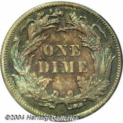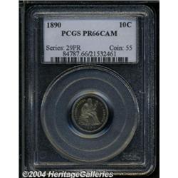 <B>1890<10C> PR66 Cameo PCGS.</B></I> An impeccable two-toned specimen that is layered in golden-rose and pale violet hues, with turquoise accents being confined to the major devices. A lovely cameo whose tonal qualities do not impede the contrast between the fields and devices. Population: 1 in 66 Cameo (5 with 5 finer at NGC), 0 finer (7/04). <BR><BR><B>Important notice:</B> Heritage usually auctions material at the rate of 200-250 lots per hour. On some occasions eBay Live bid software or the Internet may not be able to keep up with the pace of the auction. We recommend placing a realistic absentee bid now as insurance to avoid disappointment. Occasionally the auctioneer may eliminate or reject an eBay Live bid, and the auctioneer may also reopen a lot after the close of the eBay live bidding (usually because we missed an audience bid), and may reject your bid even if it shows you as the winning bidder. By bidding via eBay Live, you agree that Heritage may award the lot to another bidder at its sole discretion under the circumstances described above or any other reasonable circumstances. Since eBay bids are not shown to us until we open the lot on the floor, we treat those bids just like floor bids. In most cases the floor responds before the eBay bid is presented to us, due to Internet lag time, so for consistency we have made it a policy that floor bids are always considered first over tie eBay live bids. Also please note that all Heritage lots purchased through eBay Live carry a 20% Buyer's Premium. Please make sure you read the Terms and Conditions before you bid. </span></font></tr></table></td></tr></table>