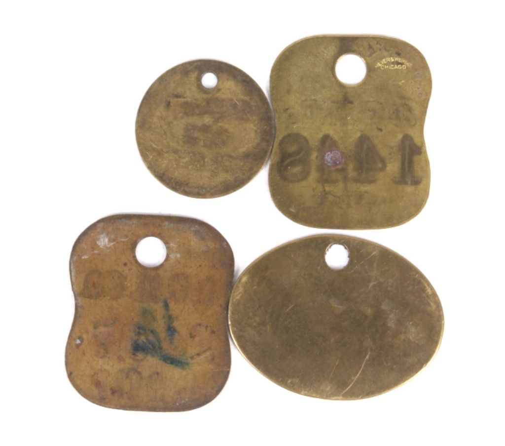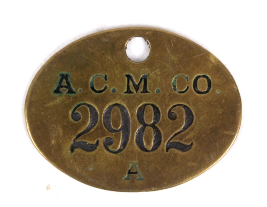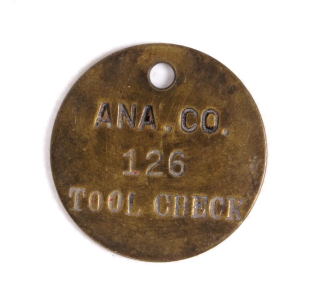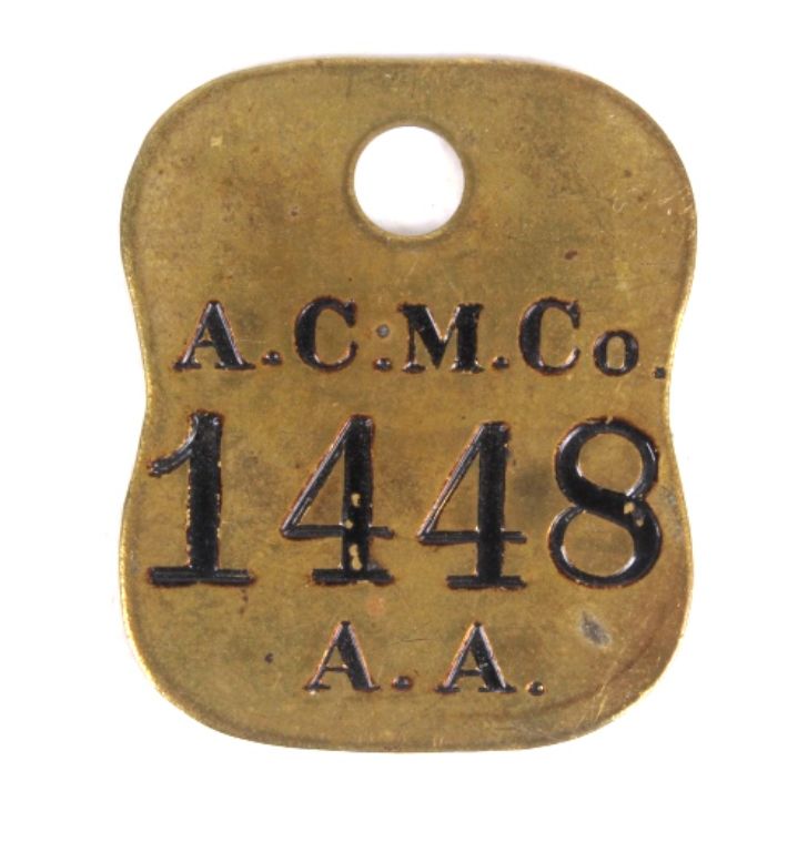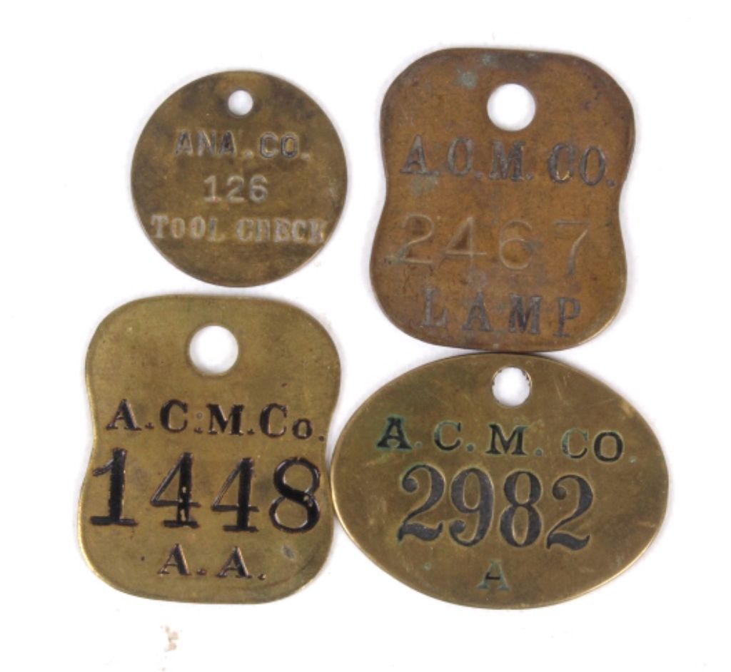 The lot features four original brass tags from the Anaconda Mining Company in Montana circa 1890-1920's. These tags were called Chinks and would be used to keep a role call of the who was in the mine. The tags are agreat piece of early Montana Mining History. The largest tag measures 1 1/4"x1 1/2"