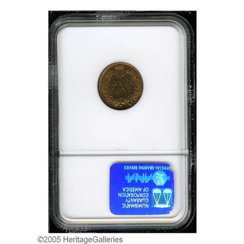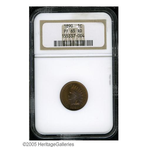 <B>1890<1C> PR65 Red NGC.</B></I> Light gold color dominates the fields, although rose-red hues fill the portrait. A whisper of aqua verdigris is noted near the date. Rare in lofty full Red grades. Population: 11 in 65, 1 finer (8/05).