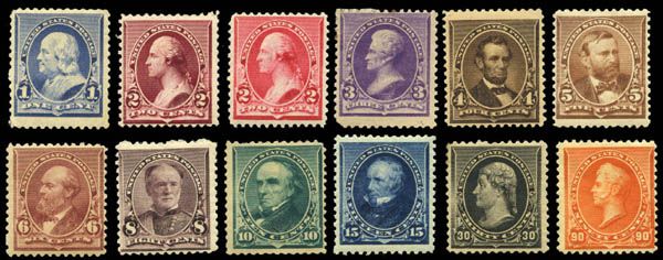 * 1890, 1¢-90¢ Complete. Including both 2¢ shades (219 and 219D). O.g. (couple with glazed gum). Fresh colors throughout, mostly well centered. 3¢ with slightly rounded corner. Fine to Very Fine.