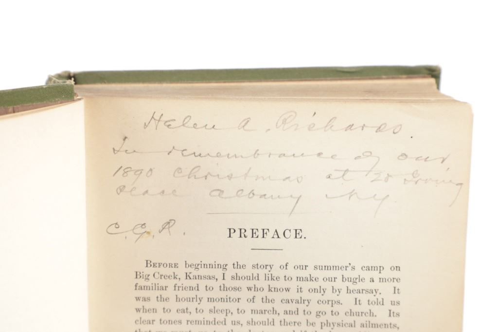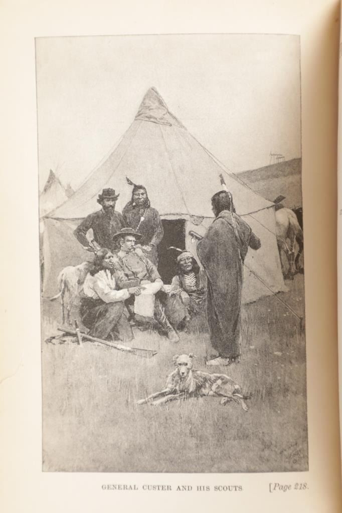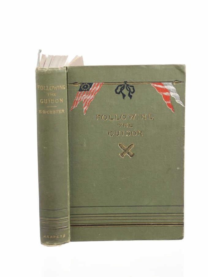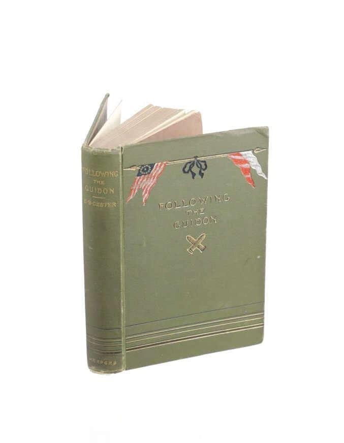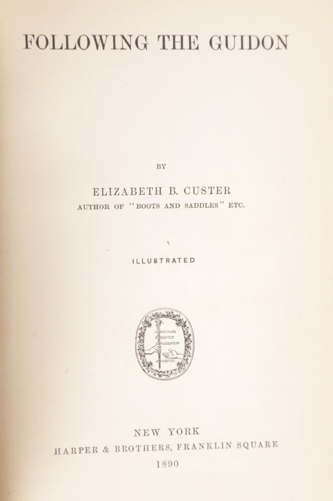 For your consideration is this First Edition of "Following the Guidon" by Elizabeth Custer, published in 1890, Harper & Brothers. The book provides a riveting account of Army life on the Western Frontier during the mid to late 1800's as told by Elizabeth Custer who was the devoted and faithful wife of General George Armstrong Custer. She wrote this book with the attempt of creating a legacy for her husband, General George Custer. She succeeded. In fact, she is without a doubt the most important force in creating a sense of legend around her late husband. She turned him into a Western hero and martyr, which slightly differs from the truth in his military failures, mainly at the Battle of Little Big Horn. This work includes a description of the march into Indian Territory, dealing with scouts, the Battle of the Washita, Indian prisoners and trials, hunting records, army housekeeping, Indian captivity of white women, and more. This original first edition displays a stamped green cloth hardcover with gold gilt lettering "FOLLOWING THE GUIDON" with a spear holding two guidon flags above and two crossed shells below. The book shows nice condition overall, age tanning and slight foxing exhibited throughout intact pages. Measures 5.25"W x 7.5"L x 1"D, weight is 1lb, 2oz.
