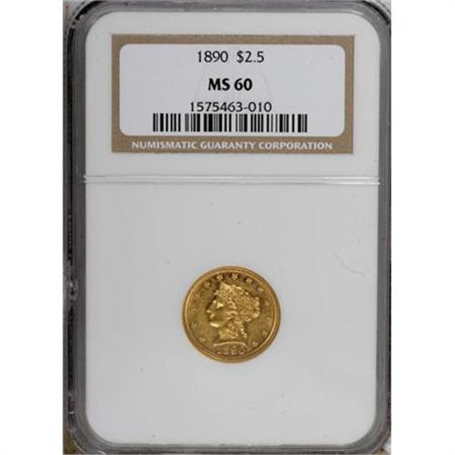 <B>1890 $2 1/2 MS60 NGC.</B></I> NGC Census: (4/109). PCGS Population (5/110). Mintage: 8,720. Numismedia Wsl. Price for NGC/PCGS coin in MS60: $460. (#7842)<BR><BR><B>Coin Engraver:</B> Christian Gobrecht<BR><BR><b>Shipping:</b> Coins & Currency (<a target="_blank" href="http://www.heritageauctions.com/common/shipping.php">view shipping information</a>\)