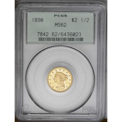 <B>1890<$2 1/2> MS62 PCGS.</B></I> Semiprooflike with reflective honey-gold fields and well struck devices. Light, scattered abrasions appear over both sides of the coin.