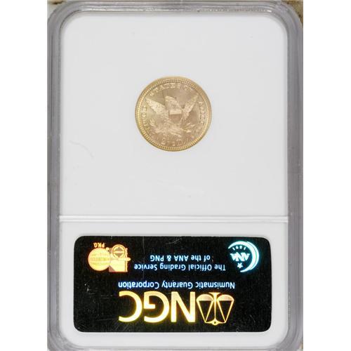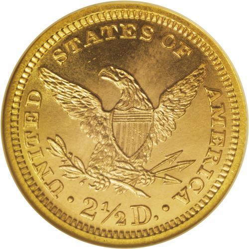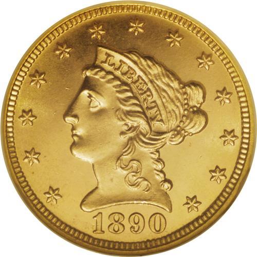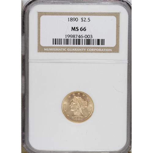 <B>1890 $2 1/2 MS66 NGC.</B></I> Low mintage quarter eagles from the 1880s and 1890s combine both scarcity and collectibility, and it is surprising that relatively few numismatists collect this subset. Despite a tiny mintage of 8,720 pieces, the 1890 is obtainable and affordable in Mint State. Of course, the present flashy Premium Gem is much better than the usual 1890, since the semi-prooflike fields are nearly immaculate. The strike is also exquisite, and only a single shiny spot on the neck prevents an even finer grade. Attractive brass-gold color adorns both sides. Virtually unimprovable quality for this scarcer date. The die scratch in the mid-right side of the shield is present on some, if not all, examples (Jeff Garrett and Ron Guth, 2006). Census: 7 in 66, 1 finer (2/07).<BR><BR><b>Shipping:</b> Coins & Currency (<a target="_blank" href="http://www.heritageauctions.com/common/shipping.php">view shipping information</a>)