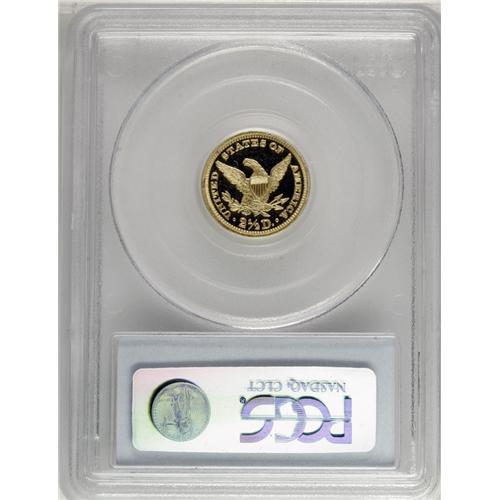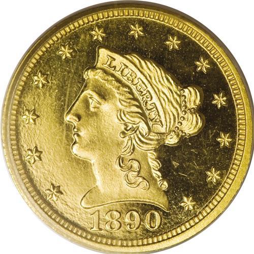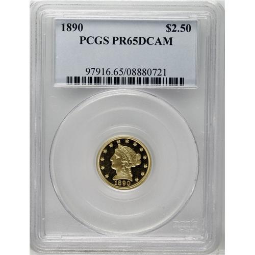 <B>1890 $2 1/2 PR65 Deep Cameo PCGS.</B></I> Jeff Garrett and Ron Guth (2006) write: "The mintage for the quarter eagle increased again in 1890 to the levels of production seen in the late 1880s. The demand for Proof gold coinage must have increased about this time as well because the number of surviving examples is dramatic. There are probably more than 50 specimens of the 1890 Liberty Head quarter eagle known. This includes two choice examples in the Smithsonian." Slightly over 30 proof 1890 quarter eagles have been seen by PCGS and NGC, along with nearly 20 Cameos, and a little over 20 Deep/Ultra Cameos.<BR> This Gem Deep Cameo specimen displays lovely brass-gold color and crisply impressed design elements. Frosted motifs stand out against spectacular deep mirrored fields, and both sides are devoid of mentionable marks. Population: 2 in 65 Deep Cameo, 4 finer (11/06).<BR><BR><b>Shipping:</b> Coin/Currency (<a target="_blank" href="http://www.heritageauctions.com/common/shipping.php">view shipping information</a>)