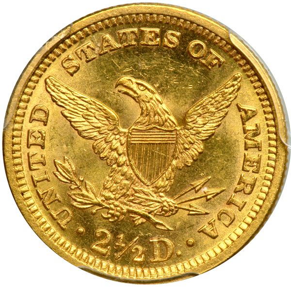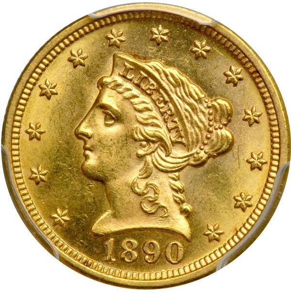 1890 $2.50 Liberty. PCGS graded MS-63 PQ CAC Approved. Only 8,720 minted. Light gold toning with reflective fields. Pop 29; 28 finer, 24 in 64, 3 in 65, 1 in 66 (PCGS # 7842) .