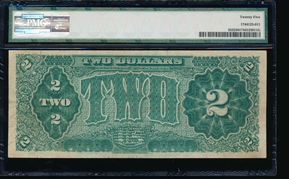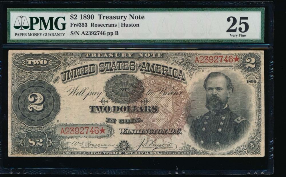 One 1890 $2 Treasury Note PMG 25 Very Fine.