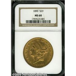 <B>1890 $20 MS60 NGC.</B></I> Semi-bright straw-gold surfaces display sharply struck devices and a few light to moderate abrasions.