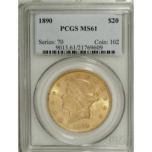 <B>1890 $20 MS61 PCGS.</B></I> This is a lower mintage issue (75,995 coins) that is somewhat scarce in Mint State and rarely seen above the MS62 grade level. The current example is boldly struck and intensely lustrous with alluring yellow-gold coloration and a normal number of trivial surface blemishes for the grade. <BR><BR><b>Shipping:</b> Coins & Currency (<a target="_blank" href="http://www.heritageauctions.com/common/shipping.php">view shipping information</a>)