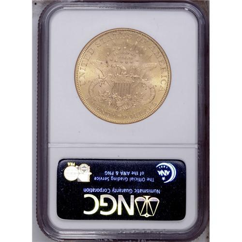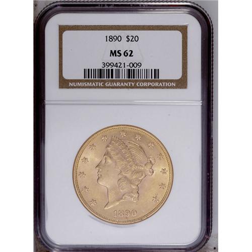 <B>1890<$20> MS62 NGC.</B></I> Apricot-gold surfaces display somewhat subdued luster and scattered light contact marks. The design elements are well brought up.