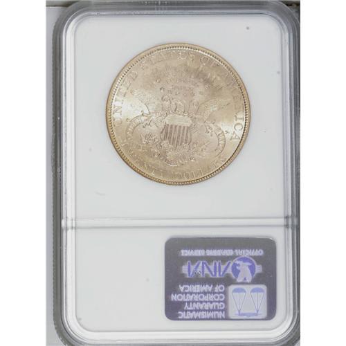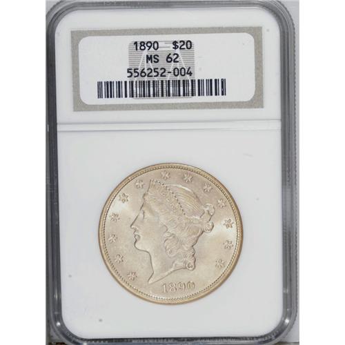 <B>1890 $20 MS62 NGC.</B></I> The wheat-gold surfaces have pleasing honey accents. The boldly struck devices emerge from highly lustrous fields that have scattered marks, including one in the center of the reverse glory.<BR><I>From The Jones Beach Collection.</B></I><BR><BR><b>Shipping:</b> Coin/Currency (<a target="_blank" href="http://www.heritageauctions.com/common/shipping.php">view shipping information</a>)