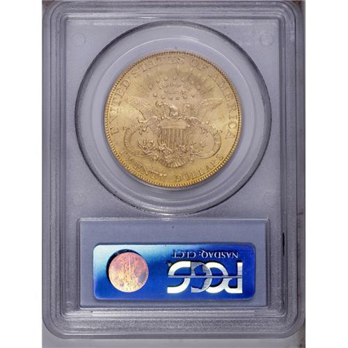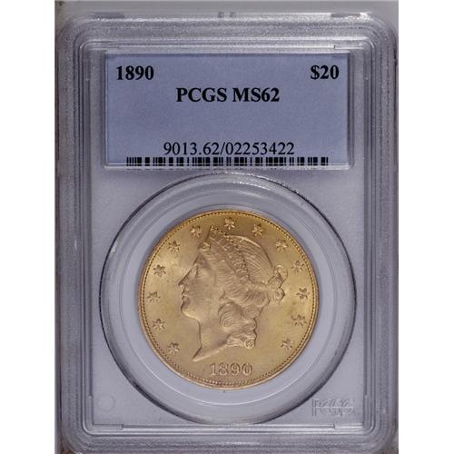 <B>1890 $20 MS62 PCGS.</B></I> Cartwheel luster is unbroken throughout this canary-gold Double Eagle, and no untoward marks are detected. From a relatively low mintage of less than 76,000 pieces. The 1 in the date is repunched at the peak.