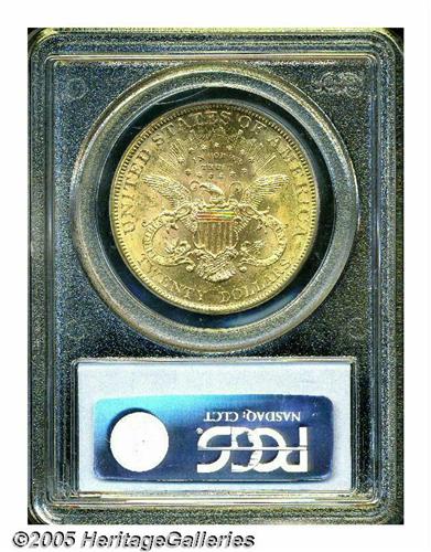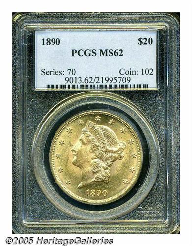 <B>1890<$20> MS62 PCGS.</B></I> Lustrous and mildly frosty, with meticulously struck features, pleasing yellow-gold coloration, and typically abraded surfaces, for the MS62 grade. Much scarcer than the mintage of 75,940 business strikes would indicate, this issue is seldom seen at the current grade level, and becomes very hard to locate any finer. PCGS has rated 33 pieces higher (6/05).