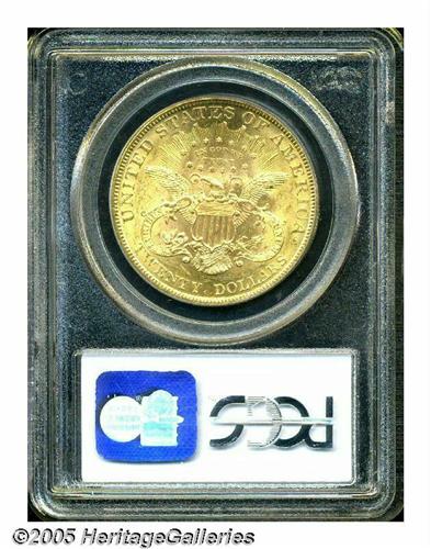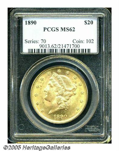 <B>1890<$20> MS62 PCGS.</B></I> finer. Lustrous and mildly frosty, with meticulously struck features, pleasing pink and yellow-gold coloration, and typically abraded surfaces, for the MS62 grade. Much scarcer than the mintage of 75,940 business strikes would indicate, this issue is seldom seen at the current grade level, and becomes very hard to locate any finer. Population: 113 in 62, 32 finer (5/05).