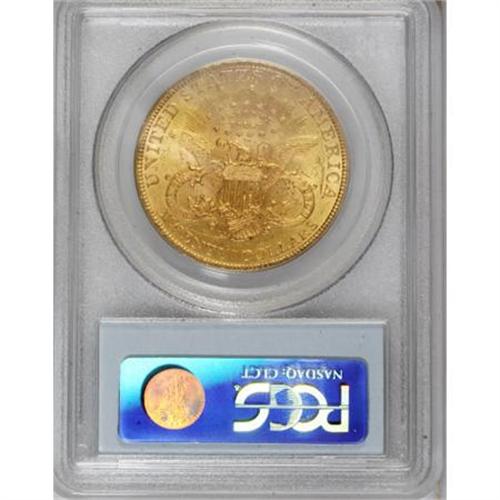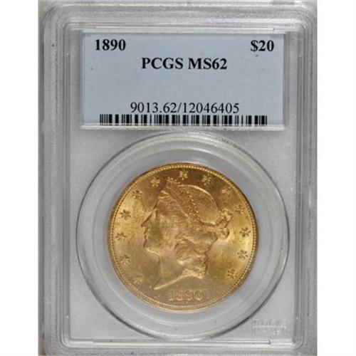 <B>1890 $20 MS62 PCGS.</B></I> Lightly abraded surfaces display peach-gold color with tints of green. Sharply struck, and with a nearly uninterrupted luster flow.<BR><BR><B>Coin Engraver:</B> James B. Longacre<BR><BR><b>Shipping:</b> Coins & Currency (<a target="_blank" href="http://www.heritageauctions.com/common/shipping.php">view shipping information</a>)