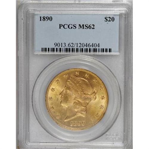 <B>1890 $20 MS62 PCGS.</B></I> Soft luster issues from khaki-gold surfaces tinted with hints of light tan. Well struck, with several minute marks scattered about, especially on the obverse. Difficult to find much finer.<BR><BR><B>Coin Engraver:</B> James B. Longacre<BR><BR><b>Shipping:</b> Coins & Currency (<a target="_blank" href="http://www.heritageauctions.com/common/shipping.php">view shipping information</a>)