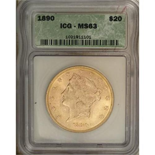 <B>1890 $20 MS63 ICG.</B></I> Only 75,955 business strikes were produced of this issue and the 1890 double eagle is a very scarce item in all grades, with Uncirculated pieces showing up at auction on an infrequent basis. This is a lovely coin for the grade that shows pinpoint striking definition and frosted mint luster that is more suggestive of a San Francisco coin than one from Philadelphia. Lightly abraded with no obvious or especially distracting marks on either side, the surfaces display even reddish patina and are obviously original and unaltered. <BR> <BR><BR><B>Coin Engraver:</B> James B. Longacre<BR><BR><b>Shipping:</b> Coins & Currency (<a target="_blank" href="http://www.heritageauctions.com/common/shipping.php">view shipping information</a>)