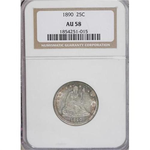 <B>1890 25C AU58 NGC.</B></I> NGC Census: (9/148). PCGS Population (5/158). Mintage: 80,000. Numismedia Wsl. Price for NGC/PCGS coin in AU58: $310. (#5523)<BR><BR><B>Coin Engraver:</B> Christian Gobrecht<BR><BR><b>Shipping:</b> Coins & Currency (<a target="_blank" href="http://www.heritageauctions.com/common/shipping.php">view shipping information</a>\)