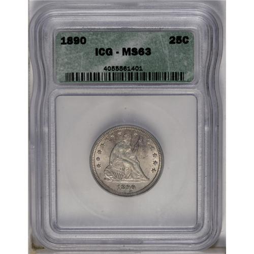 <B>1890<25C> MS63 ICG.</B></I> Patches of cobalt-blue and violet toning cover parts of the light gray surfaces. Lustrous and well struck, with the light marks one would expect for the grade.