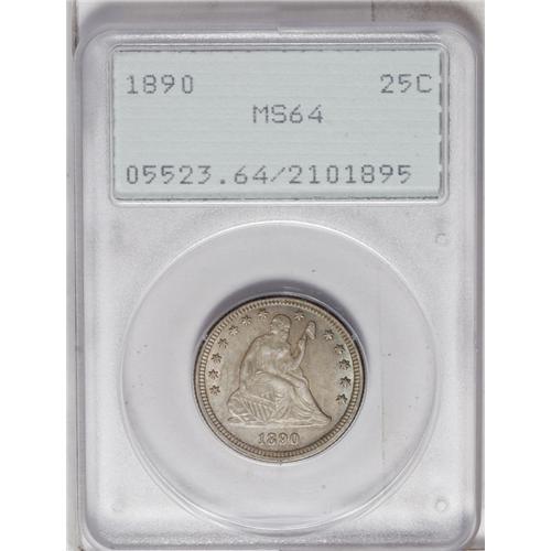 <B>1890<25C> MS64 PCGS.</B></I> Pleasing light gray to amber and blue iridescent patina embraces the attractive surfaces of this penultimate year of the Seated Liberty quarter. A beautiful example, housed in a first-generation PCGS holder. Population: 44 in 64, 72 finer (8/06).
