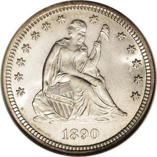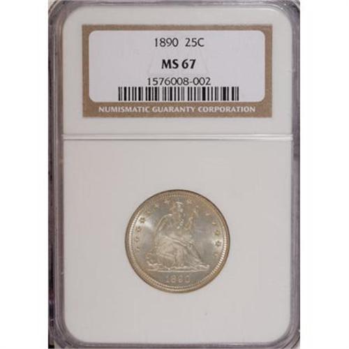 <B>1890 25C MS67 NGC.</B></I> The majority of top-quality survivors are proofs rather than business strikes. The mintage was just 80,000 coins, and few have survived in the highest grades. This example has soft, frosty silver luster with predominately brilliant silver surfaces that are accented by a faint trace of peripheral gold toning. Census: 22 in 67, 4 finer (1/08).<BR><BR><B>Coin Engraver:</B> Christian Gobrecht<BR><BR><b>Shipping:</b> Coins & Currency (<a target="_blank" href="http://www.heritageauctions.com/common/shipping.php">view shipping information</a>)
