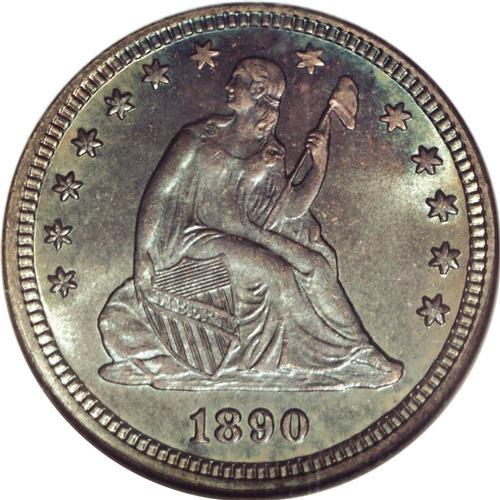 1890 25C MS68 NGC. Cherry-red, powder-blue, and sea-gr