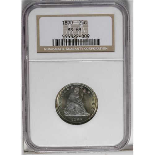 <B>1890 25C MS68 NGC.</B></I> Cherry-red, powder-blue, and sea-green toning graces this thoroughly lustrous and nearly pristine Superb Gem. The strike is penetrating save for Liberty's hair and a few star centrils. Unimprovable quality for this scarce date. Once high mintages of Morgan dollars began in 1878, the production of other silver denominations was substantially reduced for years thereafter. Dime mintages were the first to return to normal levels, in 1882. Except for an anomalous 1888-S quarter issue, production of the Seated quarters and halves remained low until 1891. The 1890 quarter, with a mintage of 80,000 pieces, has approximately the same rarity in Mint State as the 1889, which had an even lower mintage of 12,000 pieces. Presumably, the same Philadelphia-area dealer (e.g., Haseltine) retained a similar quantity of both issues for stock. Census: 4 in 68, 0 finer (10/06).<BR><BR><b>Shipping:</b> Coin/Currency (<a target="_blank" href="http://www.heritageauctions.com/common/shipping.php">view shipping information</a>)