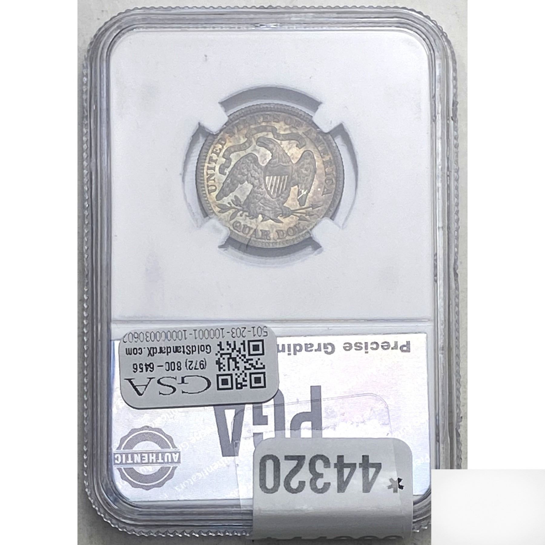 e. Coins sold referencing a third-party grading service are sold “AS IS” without any express or implied warranty, except for a guarantee by GSA that they are genuine. Removal or alteration of the holder, voids all of Bidder’s claims concerning that Product. Certain warranties may be available from the grading services and Bidders are referred to them for further details: Numismatic Guaranty Corporation (NGC), PO Box 4776, Sarasota, FL 34230, www.ngccoin.com/services/writtenguarantee.asp; Professional Coin Grading Services (PCGS), PO Box 9458, Newport Beach, CA 92658, www.pcgs.com/guarantee.html; ANACS, 6555 S. Kenton St., Ste. 303, Englewood, CO 80111; and Independent Coin Grading Co. (ICG), 7901 East Bellview, Ave., Suite 50, Englewood, CO 80111.