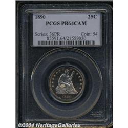 <B>1890<25C> PR64 Cameo PCGS.</B></I> The strong eye appeal generated by stark contrast and attractive peripheral toning drowns out the effect of a few wispy hairlines. Population: 2 in 64 Cameo, 1 finer (3/04).<BR><I>Ex: Kreisberg, Schulman Sale (5/66), lot 2039, where it sold for $85.</B></I> <BR><BR><B>Important notice:</B> Heritage usually auctions material at the rate of 200-250 lots per hour. On some occasions eBay Live bid software or the Internet may not be able to keep up with the pace of the auction. We recommend placing a realistic absentee bid now as insurance to avoid disappointment. Occasionally the auctioneer may eliminate or reject an eBay Live bid, and the auctioneer may also reopen a lot after the close of the eBay live bidding (usually because we missed an audience bid), and may reject your bid even if it shows you as the winning bidder. By bidding via eBay Live, you agree that Heritage may award the lot to another bidder at its sole discretion under the circumstances described above or any other reasonable circumstances. Since eBay bids are not shown to us until we open the lot on the floor, we treat those bids just like floor bids. In most cases the floor responds before the eBay bid is presented to us, due to Internet lag time, so for consistency we have made it a policy that floor bids are always considered first over tie eBay live bids. Also please note that all Heritage lots purchased through eBay Live carry a 20% Buyer's Premium. Please make sure you read the Terms and Conditions before you bid.
