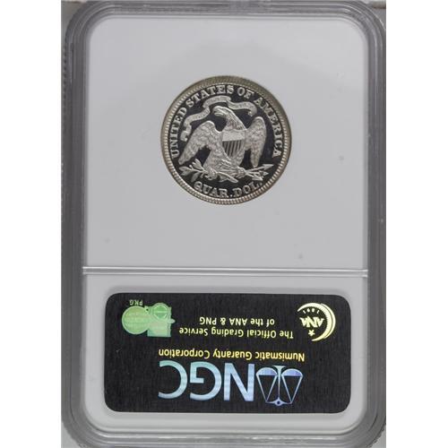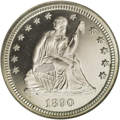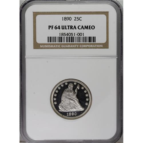 <B>1890 25C PR64 Ultra Cameo NGC.</B></I> The 1890 was a low mintage date, likely due to the continued high production of silver dollars. Only 80,000 business strikes and 590 proofs were struck. This brilliant and razor-sharp near-Gem has remarkable ice-white frost throughout the devices. The right obverse field has a few trivial hairlines, and a small mint-made strike-through is noted on the middle arrowhead. Census: 2 in 64 Ultra Cameo, 23 finer (2/07).<BR><BR><b>Shipping:</b> Coins & Currency (<a target="_blank" href="http://www.heritageauctions.com/common/shipping.php">view shipping information</a>)